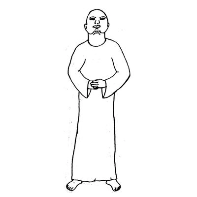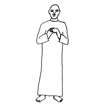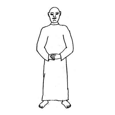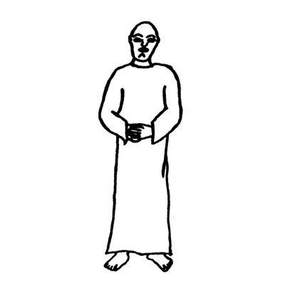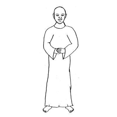 Bring the head up level, looking straight ahead. Exhale and Inhale, hit the stomach three times with the covered fist. [This represents being a human being.]