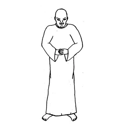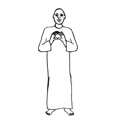 With the right fist still covered by the left hand, raise them to heart level directly in front of the chest. [This represents no harm or violence, also covering the fist means, “it is a treasure,” a treasure to hide in the pocket.]