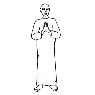 Open the right hand, and turn both hands outward so palms are directly away from you. The fingers have been straightened on both hands with thumbs spread back. Touch the tips of the thumbs and index fingers together. [This means “I am carrying no weapons. I have an open heart that wishes harm to no person or thing. With the person looking at you through the hole in your hands, means seeing only the good part of man. The hand shape represents a mountain, “my heart is like a mountain”.]