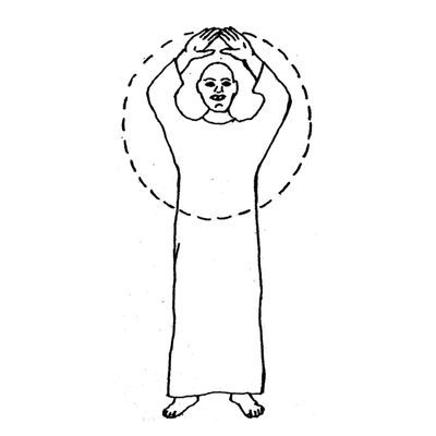 SLOWLY, swing your arms out and up on each side, bringing them up over your head. Touch your fingertips together. The crook of your arms will be about ear level. [This circle, sweeping upward and over your head, represents the Universe.]